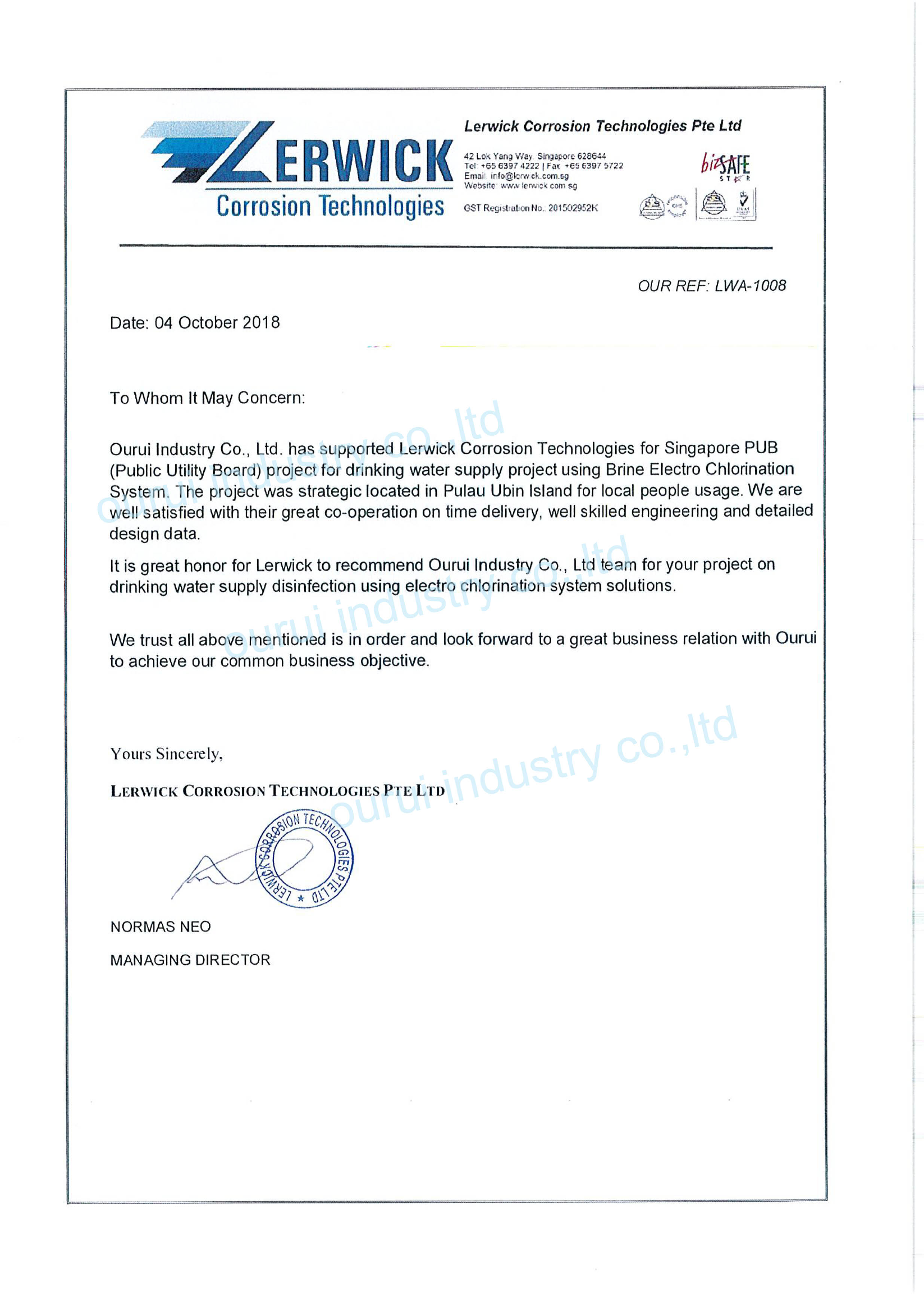 In recent years, the Orui brand sodium hypochlorite generator has been exported to Saudi Arabia, Israel, Turkey, Mongolia, Kazakhstan, Singapore and other countries, and has been used and recognized by a large number of foreign customers.