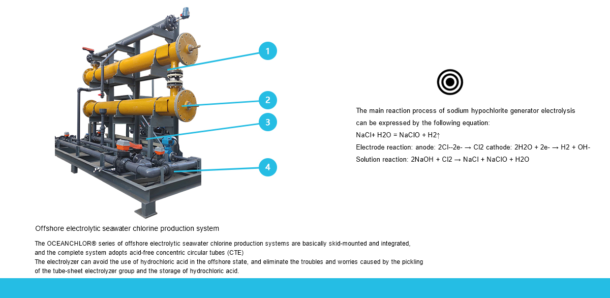 Unlike other forms of electrolytic seawater chlorine production systems, the concentric circular tube electrolyzer is designed specifically for offshore industrial applications, and does not require any pickling during its operation. The concentric circular tube electrolyzer adopts the design of inner and outer double titanium tubes. The titanium tube is coated on one side. The seawater passes through the gap in the middle of the concentric circular tube electrolyzer. The cathode and anode form a circuit loop through the conductivity of the seawater to produce electrolysis.